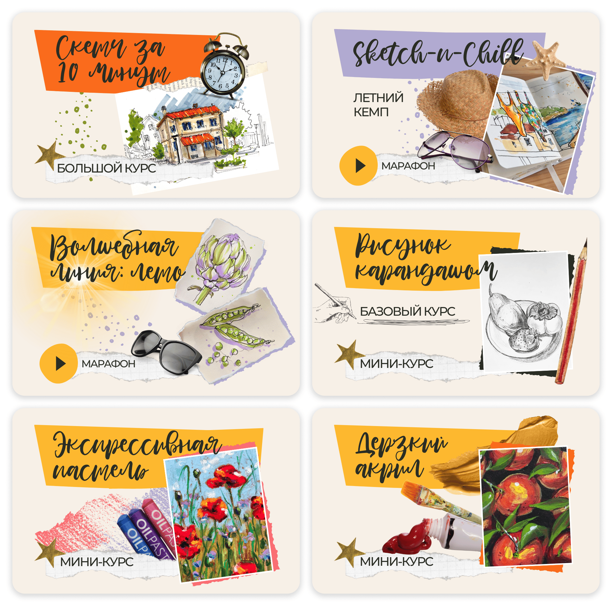 ⭐️ Попробуешь разные материалы и техники (акварель, маркеры, акрил, цветные карандаши, лайнеры, пастель и масляная пастель, микс-медиа, коллаж, диджитал).